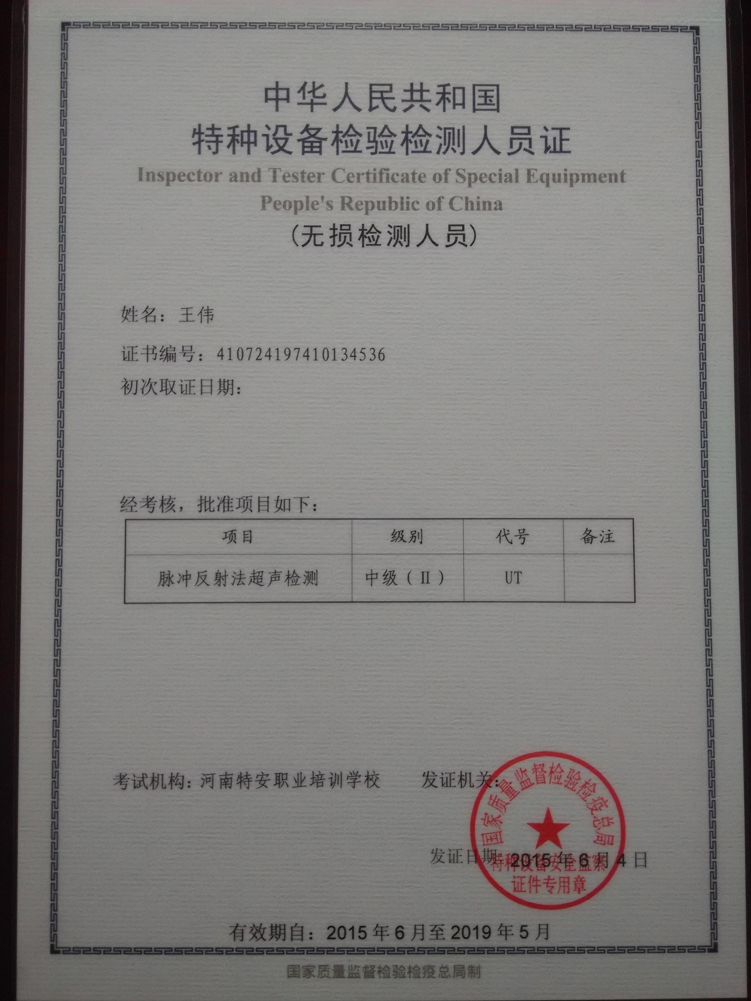 恭喜我公司王偉同志取得無損檢測人員中級(II)資格證